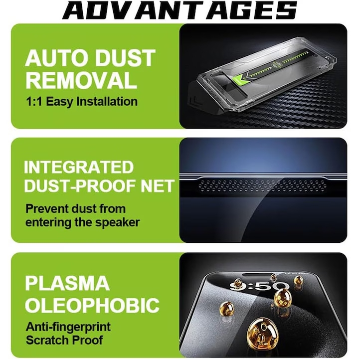 Tehnologie: Anti-Scratch/Anti amprente/Acoperire oleofoba/Compatibil cu functia 3D Touch/Rezistent la zgarieturi (duritate folie 9H)/tratament oleophobic/anti amprenta/Sticla/Securizata 9H/ULTRA-REZISTENTA/Instalare in 30 de secunde